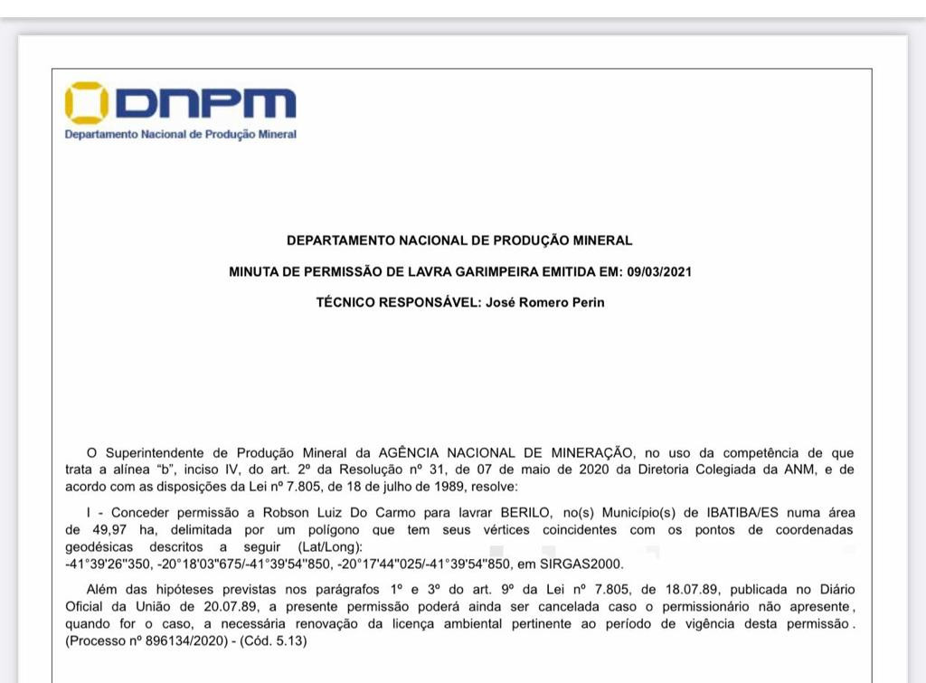 Hectares: 300 - The gold mine, whose research request was requested on 03/11/1942, the final research report was approved on 04/08/1948